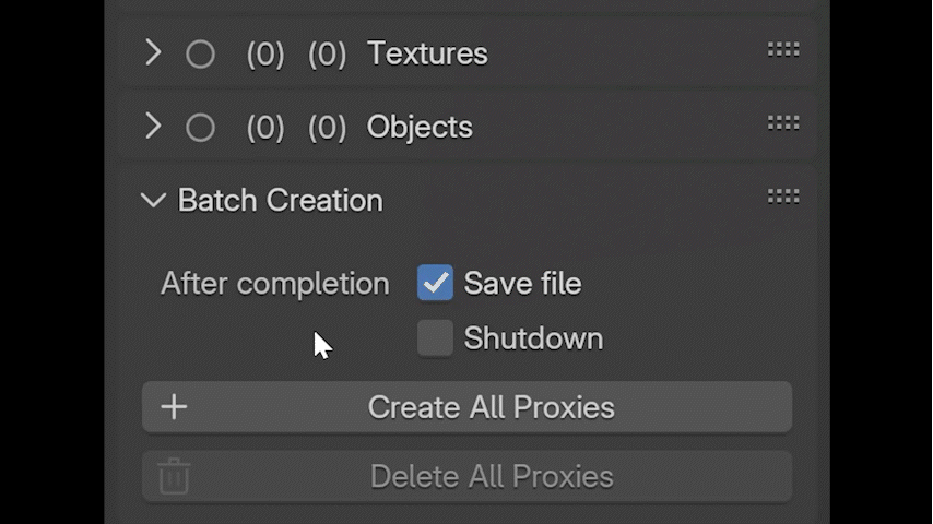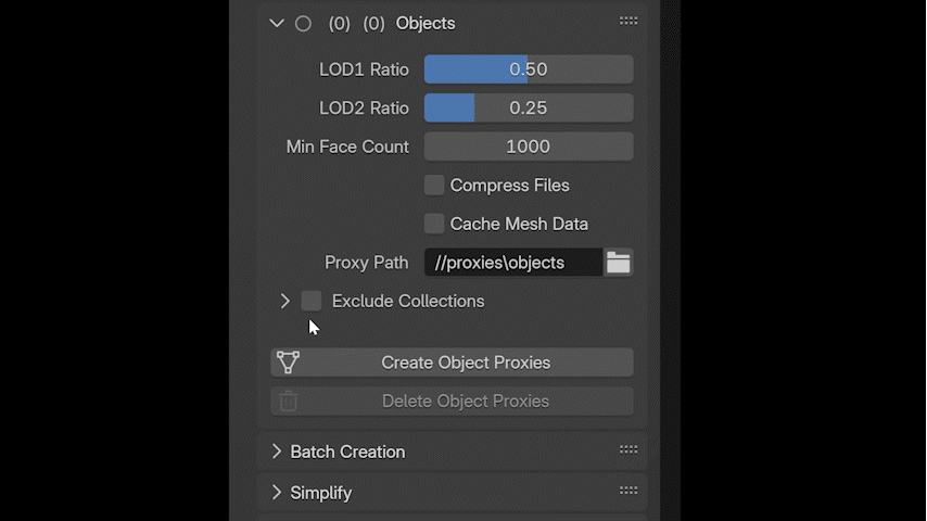 You can decide whether you want to create proxies only for the textures, meshes, or both. Each section has different parameters that can be adjusted, if needed. You can also exclude collections from the overall process or use the same proxies across different blend files without having to regenerate them because already generated proxies are automatically detected for each object.