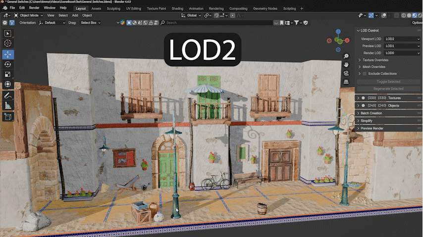 Keep in mind that especially on larger scenes, the LOD switches can take a while. We tried our best to get the best performance for the proxy creation and switching, but we can’t change how fast Blender can process different kinds of textures and meshes. Ideally, you should work in the viewport mostly at the lowest quality level without changing the levels all the time, and only change the quality for individual objects when needed. The dynamic function should mainly be used for final renders and primarily be used to set the right parameters in the viewport. It’s best to simply watch the tutorial to directly see what you need to pay attention to and how to get the best performance out of the addon.