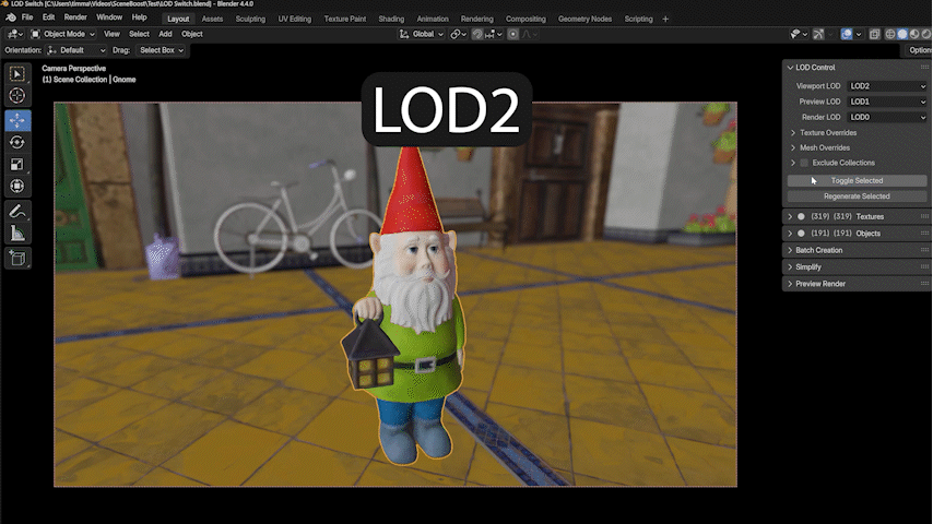Yes and no. It can create different LOD levels for every object in the scene, regardless of whether it’s scattered or not. However, you can’t use camera-based LOD switching for scattered objects, as the add-on can only measure the distance to the original object then. But for scattered objects, this isn’t important anyway, because instances of an object don’t consume additional memory.